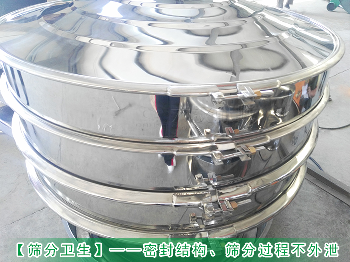 不銹鋼振動(dòng)篩整機(jī)采用密閉式結(jié)構(gòu),可以避免物料在篩分過程中溢散,防止浪費(fèi)物料的同時(shí)還對(duì)現(xiàn)場(chǎng)環(huán)境造成污染,上部分進(jìn)料口處加裝有防塵蓋、篩框與篩網(wǎng)之間有密封膠圈、軟連接等進(jìn)行隔離和密封,防止灰塵進(jìn)入混入物料中不會(huì)受到污染,所采用的密封件均為硅膠材質(zhì)符合食品行業(yè)的篩分要求。