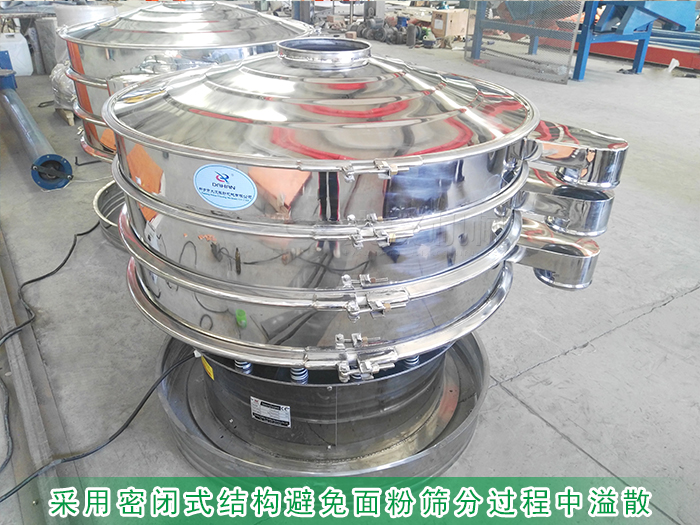 單層不銹鋼振動(dòng)篩整機(jī)采用密閉式結(jié)構(gòu),可以避免面粉在篩分過程中溢散,除了上部進(jìn)料口加裝有防塵蓋、篩框與篩網(wǎng)之間還有有密封膠圈、軟連接等進(jìn)行隔離和密封,有效防止灰塵進(jìn)入篩機(jī)內(nèi)部,所采用的密封件均為硅膠材質(zhì)符合食品行業(yè)的篩分要求。嚴(yán)格保證面粉在除雜的過程中干凈衛(wèi)生、不會受到污染。